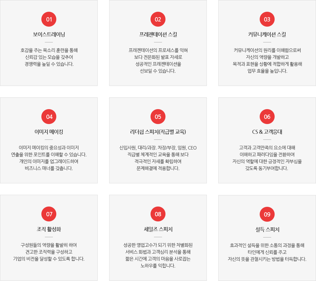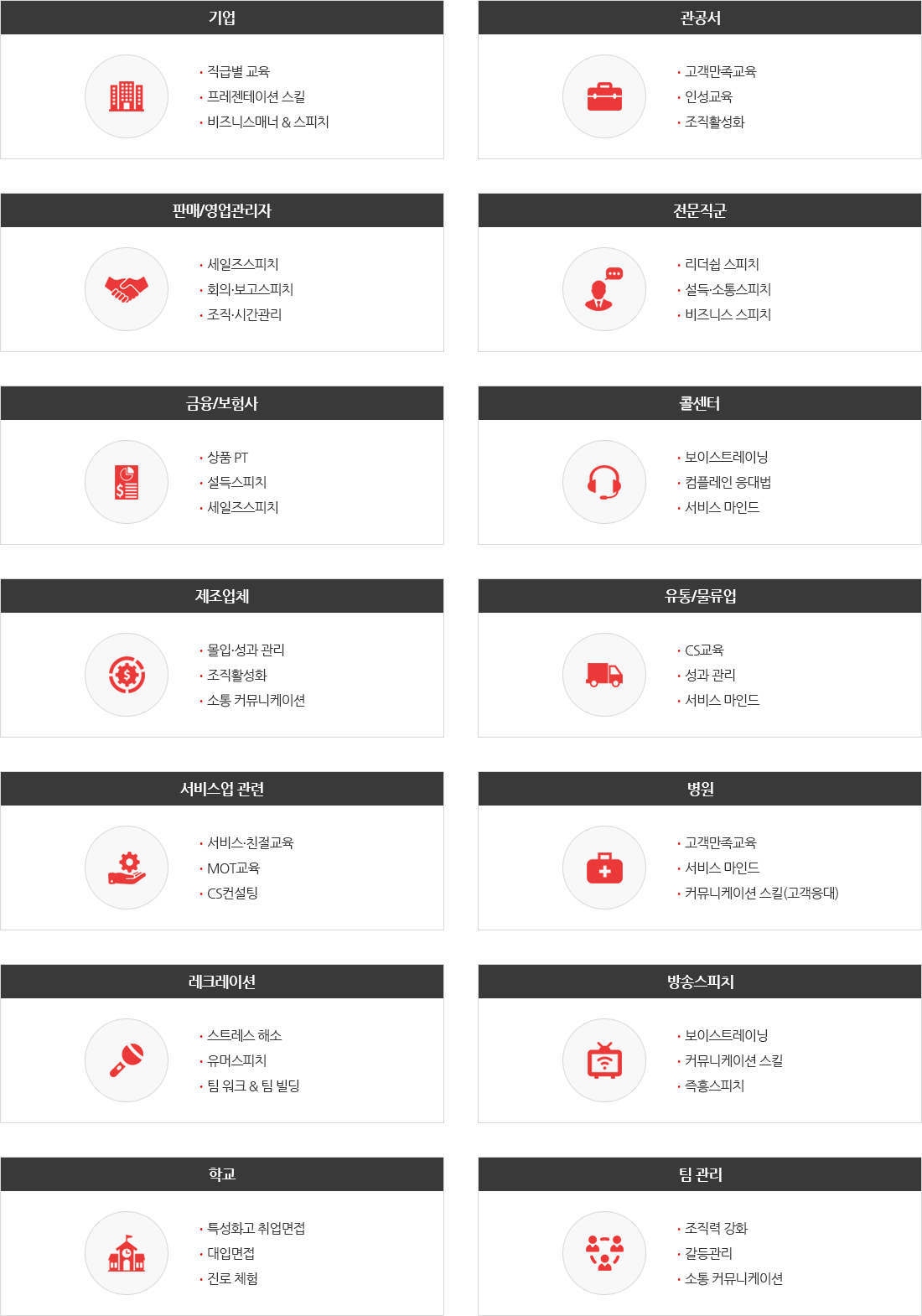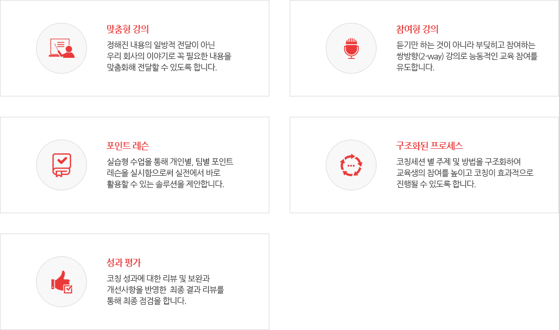 각 직급별 직군별 프로그램을 차별화하여 전사교육체계에 맞는 맞춤별 교육모듈을 제공해 드리고 있습니다.
